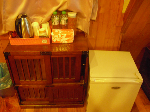 另一邊的櫃子上是熱水器、杯子(有免洗杯跟陶瓷杯)、盒裝衛生紙、寶特瓶水,旁邊是小冰箱。